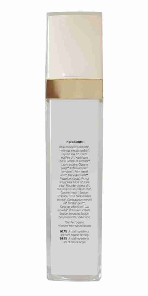 Rosa damascena distillate*, Helianthus annuus seed oil*, Glycine soja oil*, Cocos nucifera oil*, Wash base (Aqua, Potassium cocoate**, Laury betaine, Glycerin (veg)**, Potassium palm kernalate**, Palm kernal acid**, Decyl glucoside**, Potassium citrate), Prunus amygdalus dulcis oil*, Cera alba*, Rosa damascena oil*, Butyrospermum parkii butter*, Glycerin (veg)*, Sodium chloride, Citrus paradisi seed extract*, Cymbopogon martinii oil*, Xanthan gum**, Cananga odorata oil*, Lac powder*, Potassium sorbate**, Sodium benzoate**, Sodium dehydroacetate, Sorbic acid**.