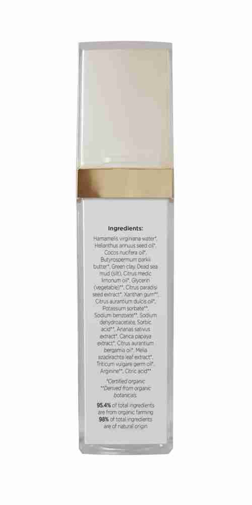 Hamamelis virginiana water*, Helianthus annuus seed oil*, Cocos nucifera oil*, Butyrospermum parkii butter*, Green clay, Dead sea mud (silt), Citrus medic limonum oil*, Glycerin (vegetable)**, Citrus paradisi seed extract*, Xanthan gum**, Citrus aurantium dulcis oil*, Potassium sorbate**, Sodium benzoate**, Sodium dehydroacetate, Sorbic acid**, Ananas sativus extract*, Carica papaya extract*, Citrus aurantium bergamia oil*, Melia azadirachta leaf extract*, Triticum vulgare germ oil*, Arginine**, Citric acid**